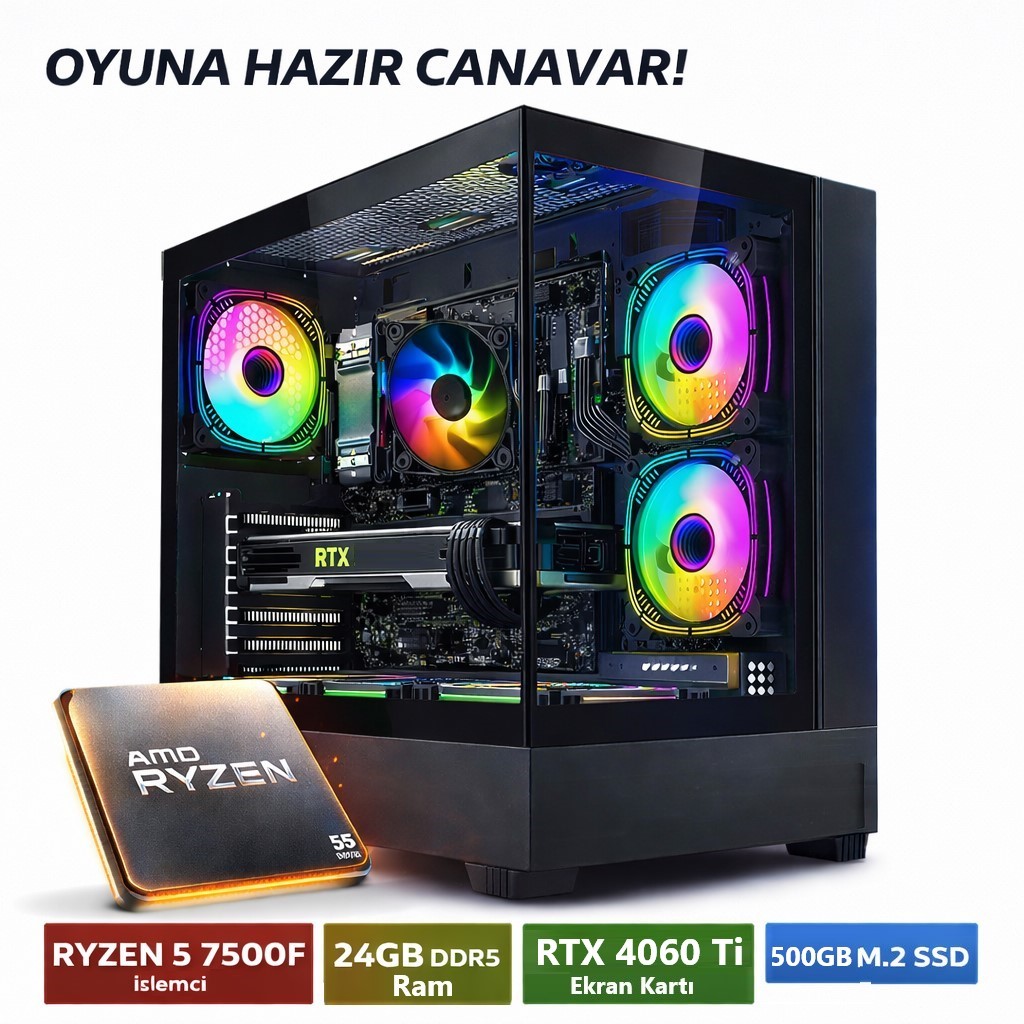 AMD Ryzen 5 7500F 24 GB DDR5 RTX 4060 TI-8GB 500GB M2 SSD Gaming Kasa